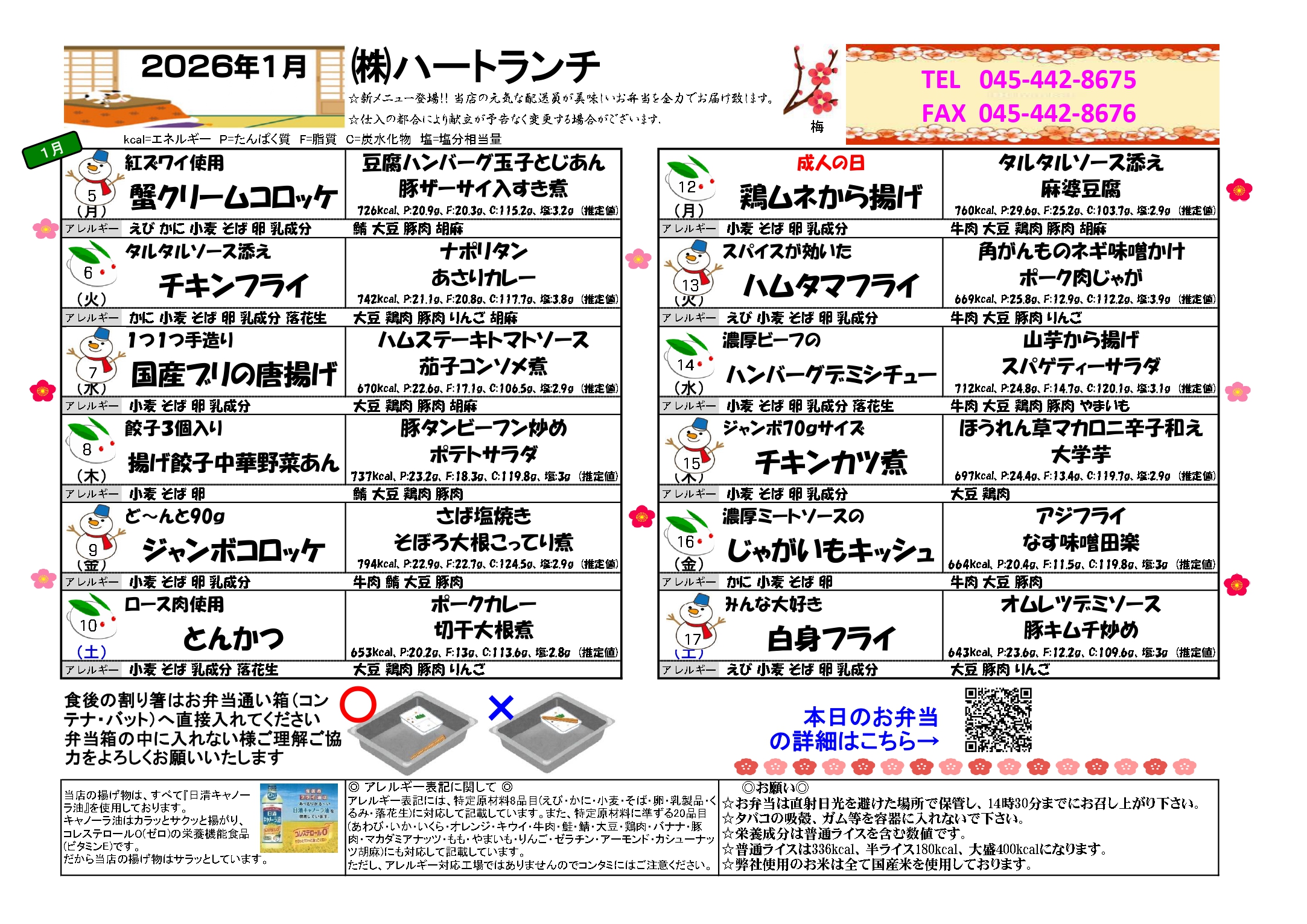 ハートランチの日替りメニュー2026年1月5日~2026年1月17日