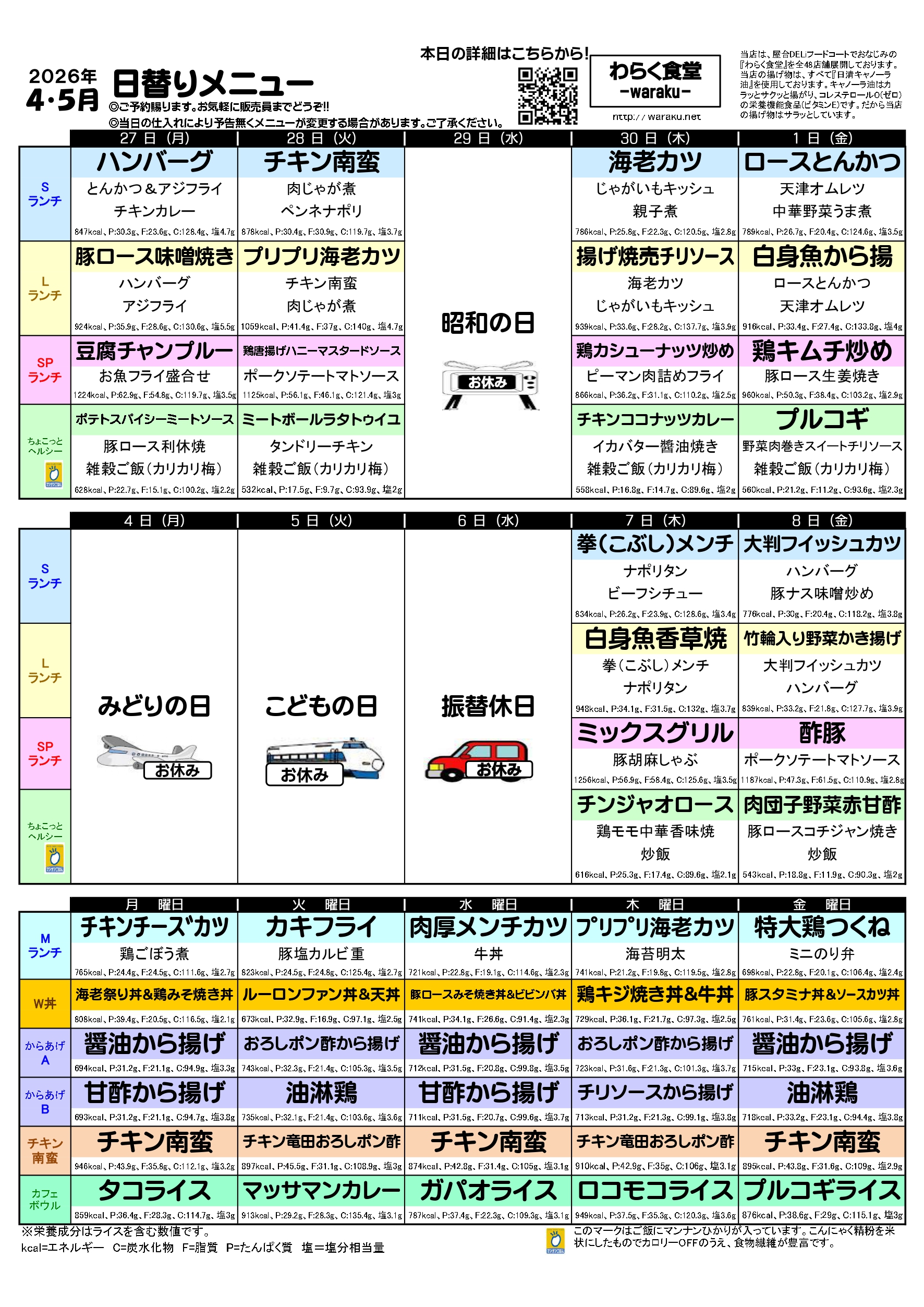 3. わらく食堂日替りメニュー2026年4月27日〜2026年5月8日